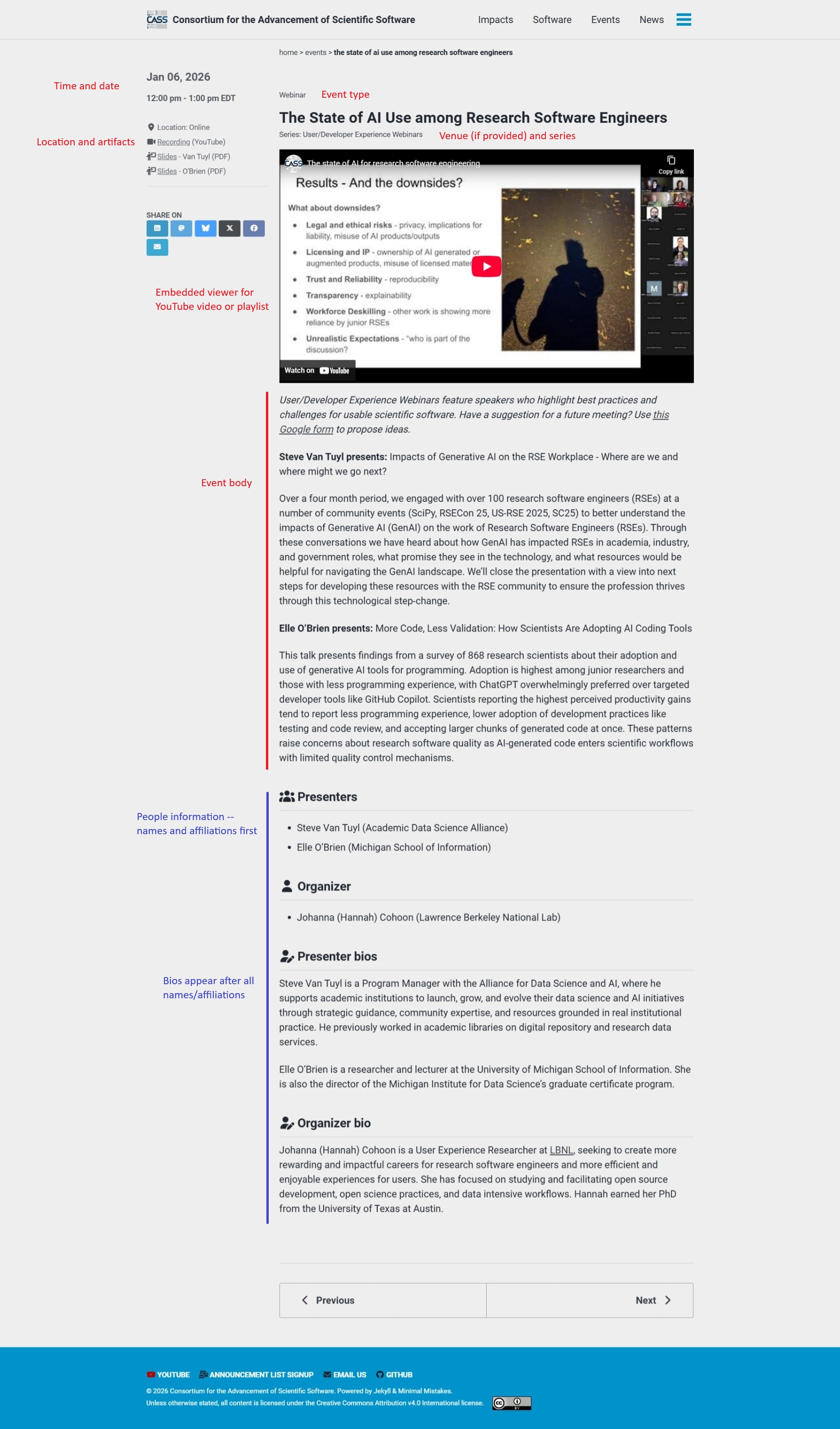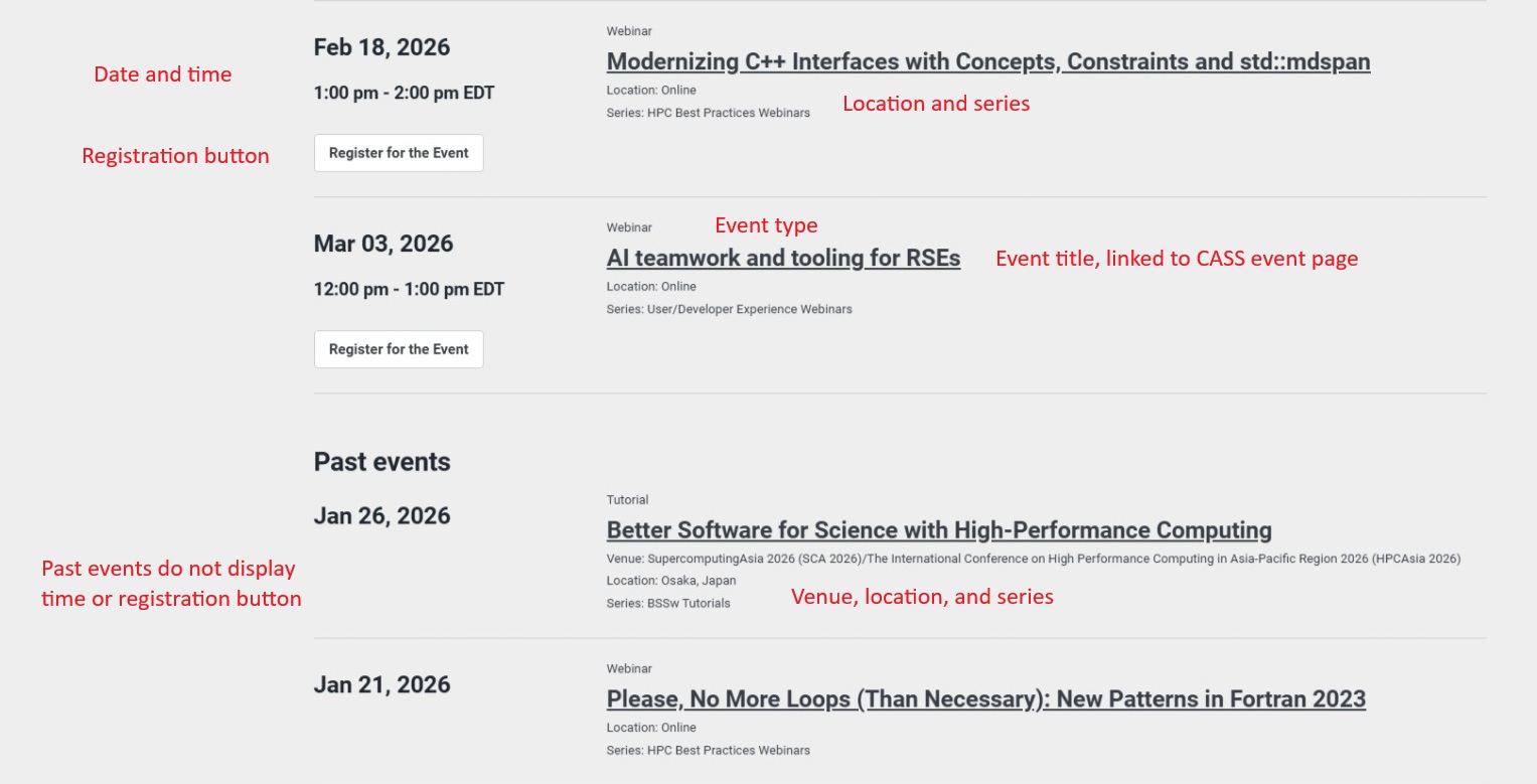 These screenshots illustrate how events are rendered on the CASS website (subject to change – hopefully the screenshots would also be updated). The annotations are meant to help connect the content that you see on the screen with the descriptions of the input that generates them, below.